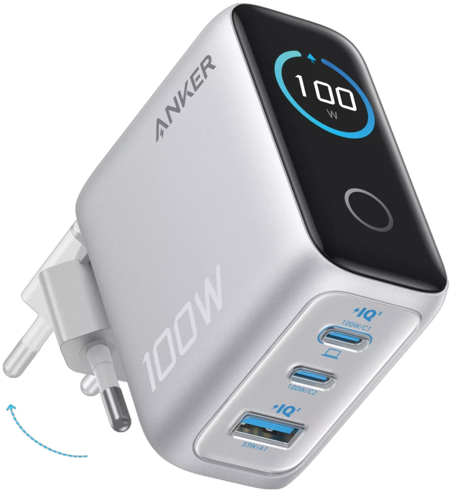 Punjač mreže s USB-C kabelom Anker Smart Display, 100W, 3A, 1 x USB-A - 2 x USB-C, Srebrni B121BG41