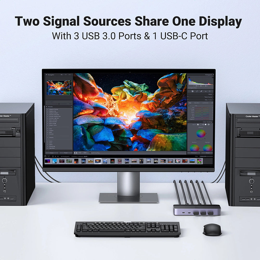 Povećajte svoju učinkovitost i optimizirajte svoj radni prostor s UGREEN CM664, multifunkcionalnim KVM video preklopnikom koji vam omogućuje kontrolu nad dva računala istovremeno