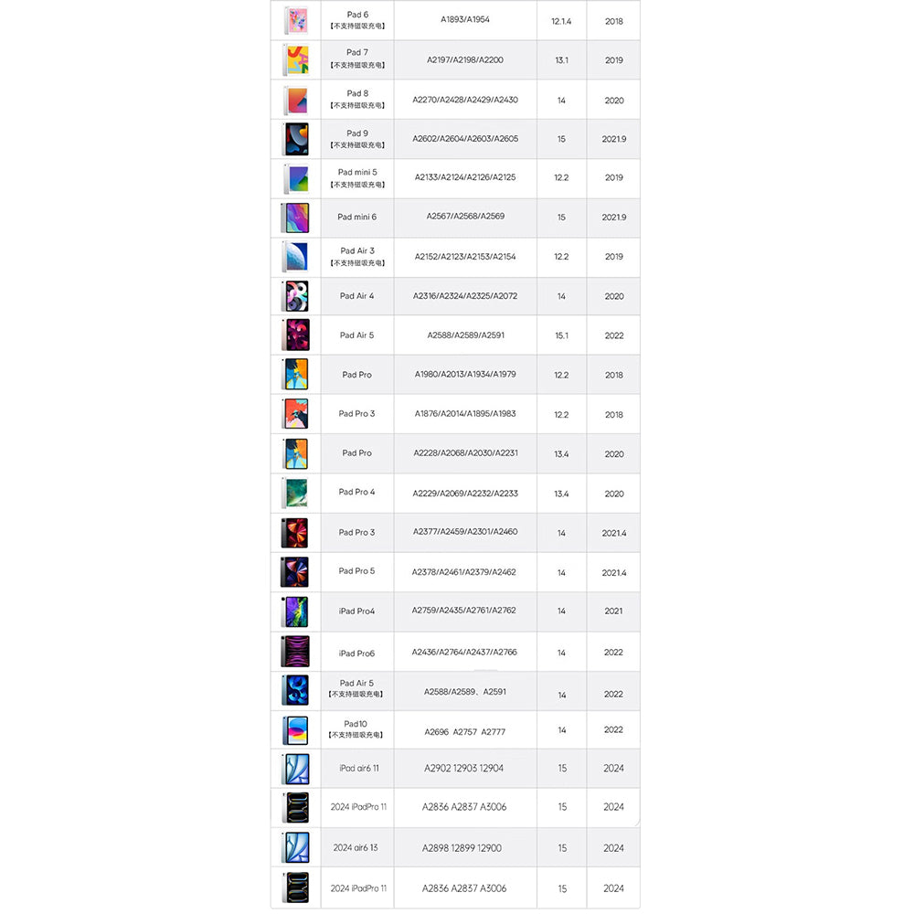 Kompatibilnost: iPad 6 (2018), iPad 7 (2019), iPad 8 (2020), iPad 9 (2021), iPad Mini 5 (2019), iPad Mini 6 (2021), iPad Air 3 (2019), iPad Air 4 (2020), iPad Air 5 (2022), iPad Pro (2018), iPad Pro 3 (2018), iPad Pro (2020), iPad Pro 4 (2020), iPad Pro 3 (2021), iPad Pro 5 (2021), iPad Pro 4 (2020), iPad Pro 6 (2022), iPad Air 5 (2022), iPad 10 (2022), iPad Air 6 11" (2024), iPad Pro 11" (2024), iPad Air 6 13", iPad Pro 11".